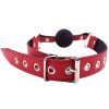 Leather, adjustable buckle strap with a red or black rubber ball gag. Gag 5.5 Inch Circumference